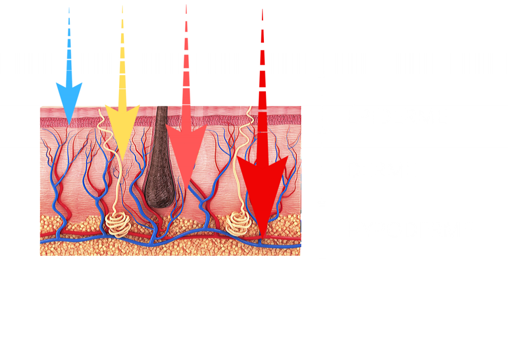 LA PÉNETRATION DES RAYONS DE LUMIÈRE LED DANS LES DIFFÉRENTES COUCHES DE LA PEAU DÉPEND DE LEUR LONGUEUR D’ONDE.